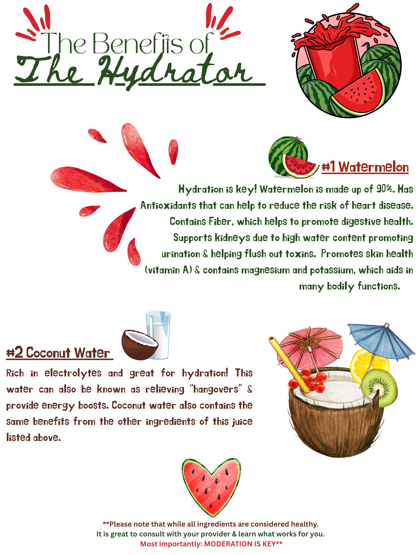 Made with Watermelon & Coconut Water. This juice is good for its antioxidant properties, heart health, & major hydration (electrolytes). This juice is also great for hangovers.